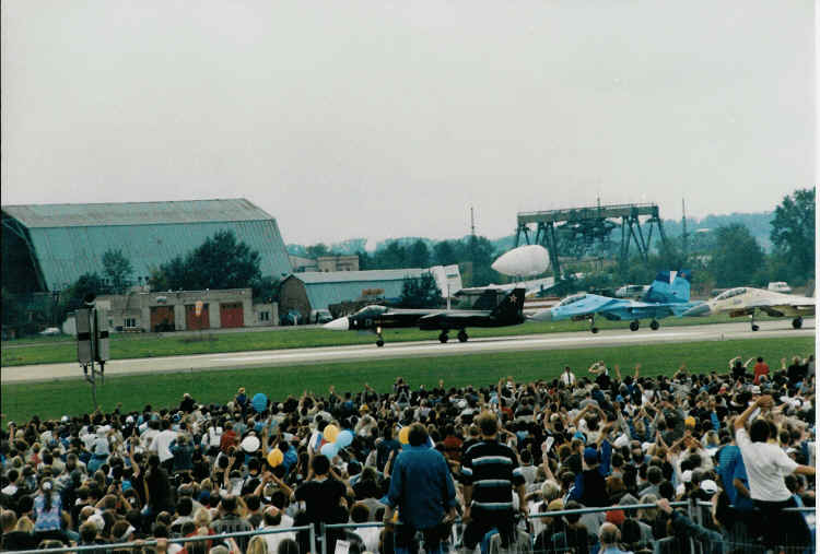 Das weiße eiförmige Objekt ist der Transportbehälter einer Myasishchev VM-T (Mya-4 "Bison" mit Doppelleitwerk zum Transport von Teilen für die "Buran" bzw. "Energija" Rakete). In diesem Fall der kleinere Behälter; der große reicht über die gesamte Rumpflänge. |