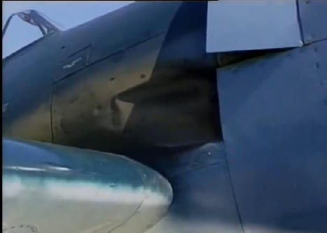| Helle Rauchspuren links bei einer P-57 Thunderbolt (aus einem USAAF-Film) rechts breitflächig auf der Tragfläche einer F6F-5N Hellcat der VF-90