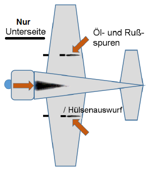 Für Abgasspuren von Bordwaffen gilt übrigens das Gleiche. Auch hier ist, wie jeder Rekrut bestätigen kann, das Abfeuern eines Schusses mitnichten vom Ausstoß einer schwarzen Rußwolke begleitet. Und auch hier ist der Rauch hell. Dunkle Ablagerungen könnten nur im Lauf der Zeit durch Überlagerung entstehen.